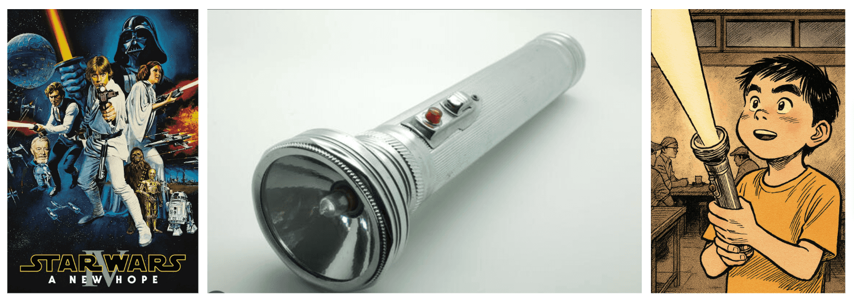 I impulsively ran home, grabbed a flashlight, and rushed back. If you lived around that time, you probably remember those standard silver flashlights with the red button. Doesn’t it look like a lightsaber? I turned it on and started playing around, but the light beam kept going and hit the ceiling. I asked my uncle if there was any way to make the light stop shorter. He said, “It’s not possible. We still don’t have the technology to limit the length of light yet.”